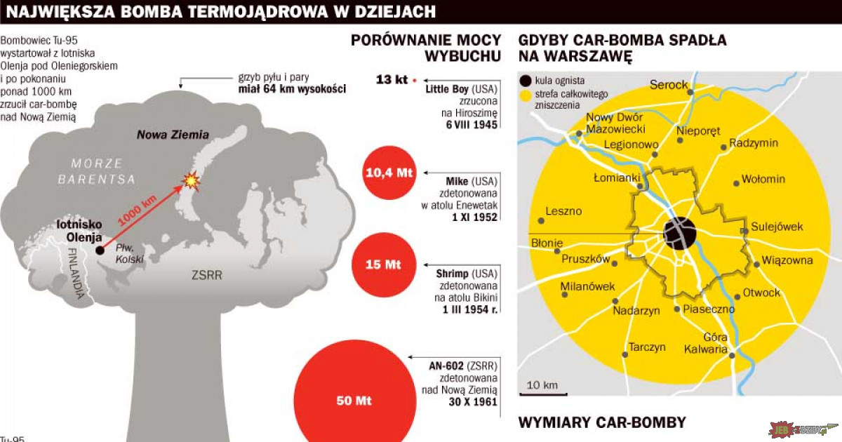 Самое мощное взрывное устройство за всю историю человечества. Полная энергия взрыва, по разным данным, составляла 58,6 мегатонны в тротиловом эквиваленте, или около 2,4 х 1017 Дж (что соответствует дефекту массы 2,65 кг).