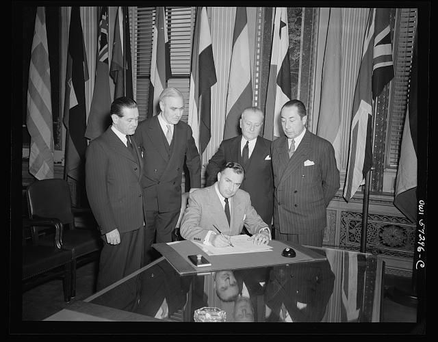 Посол Соединенных Штатов Америки Хулиан Р. Касерес и Председатель делегации Гондураса подписывают Устав ООН на церемонии, состоявшейся 26 июня в Мемориальном комплексе ветеранов войны в Сан-Франциско, штат Калифорния, США. Официально Организация Объединенных Наций была создана спустя четыре месяца, 24 октября 1945 года. Фото ООН/МакЛейн