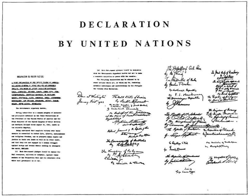 В первый день 1942 года президент Франклин Рузвельт — от США, премьер-министр Уинстон Черчилль — от Соединенного Королевства, Максим Литвинов — от имени Советского Союза, и Цзы-вень — от имени Китая, подписали краткий документ, который впоследствии стал известен как «Декларация Объединенных Наций». На следующий день эта Декларация была подписана также представителями 22 других государств. Этим важным документом подписавшие его государства приняли на себя торжественное обязательство приложить максимум усилий для достижения победы и не заключать сепаратного мира.