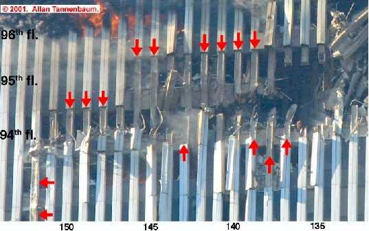 Фото ближе, которые показывает, где должно было быть левое крыло «самолета». Посмотрите на столбец с надписью 145 и слева от него — стальные балки даже не разрушены. 2 человека в этом фото с правой стороны. Фото из NIST отчета.