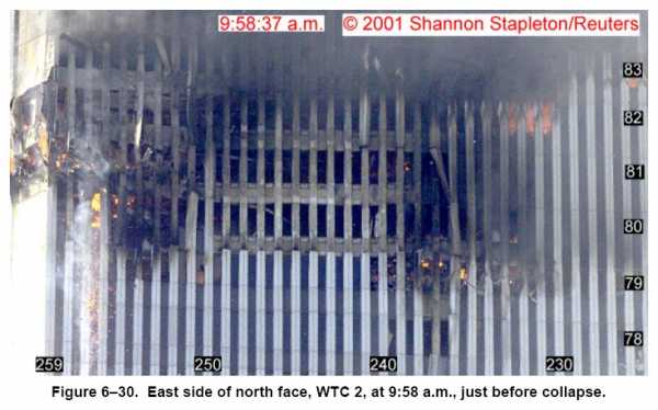 Учитывая, что пожары в обеих Башнях были вызваны примерно одинаковым количеством керосина и, учитывая, что Башни были Близнецы (т.е. абсолютно идентичны по прочности), это несоответствие было первым явным признаком того, что их разрушение не имело никакого отношения к пожару.