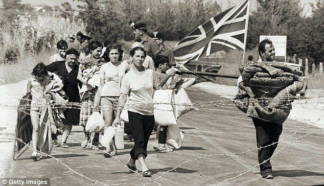 Подпись к изображению,Напряженность между киприотами-греками и киприотами-турками переросла в насилие вскоре после обретения независимости острова. Греки и турки-киприоты бегут в противоположных направлениях.