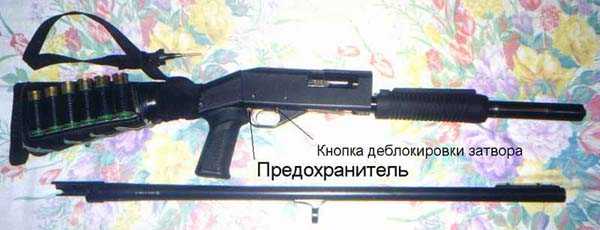 Цевье удлинено назад и заходит в заднем положении на ствольную коробку. Предохранитель легкодоступен. Все детали ружья стальные