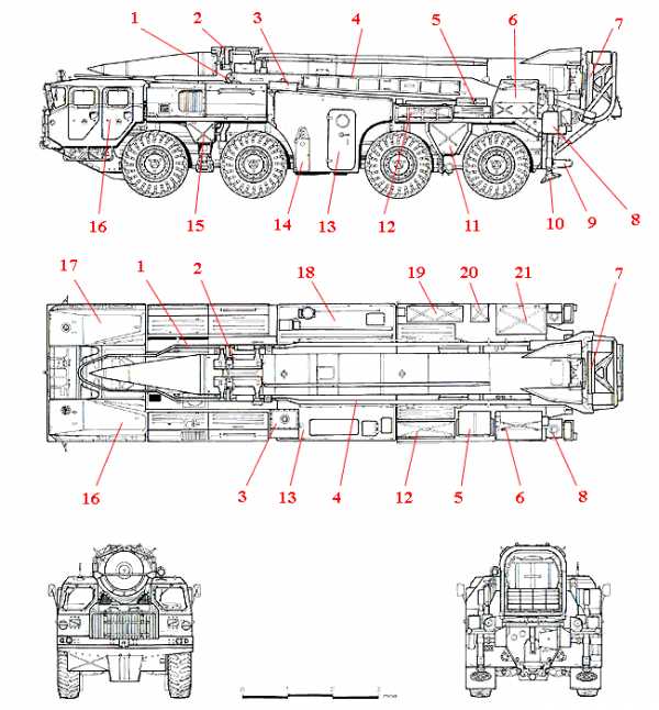 1 балансир; 2 захваты; 3 бак гидросистемы; 4 стрела; 5 ДК-4; 6 два мерных бака с пусковым горючим; 7 пусковой стол; 8 пульт управления стрелой, домкратами и упорами; 9 упоры; 10 опоры; 11 пульт СПО 9В46М; 12 4 воздушных баллона высокого давления; 13 рубка оператора с пультовой аппаратурой РН, ЩУГ,ПА, 2В12М-1, 2В26, П61502-1, 9В362М1, 4А11-Э2, ПОГ-6; 14 АКБ; 15 ящик выносного пульта 9В344;16 в кабине 2 баллона воздушного запуска маршевого двигателя; 17 под кабиной ГДЛ-10; 18 в рубке АПД-8-П/28-2 и приборы из комплекта 8Ш18; 19 эквивалент СУ 2В34; 20 эквивалент САПР 2В27; 21 приборы из комплекта 8Ш18