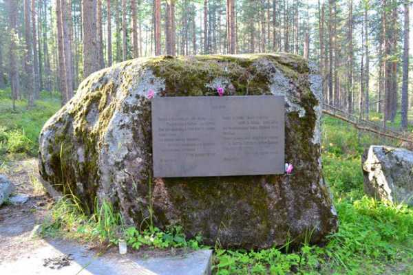 Здесь на большом валуне установлена мемориальная табличка с такими словами на русском и финском языках.