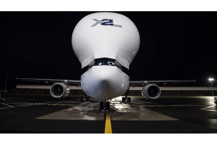 Вид спереди летящего Beluga с выпуклым фюзеляжем
