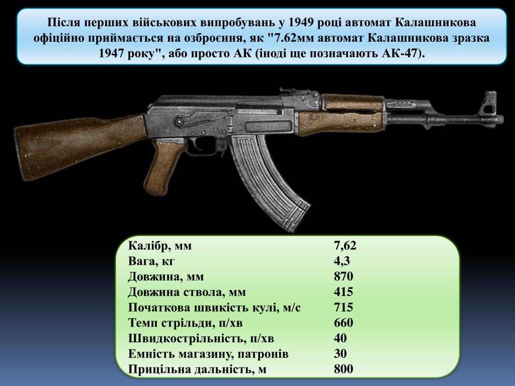В конце 1949 года по результатам войсковых испытаний новый автомат был принят на вооружение Советской армии в двух вариантах под обозначениями «7.62мм автомат Калашникова АК» и «7.62мм автомат Калашникова со складным прикладом АКС» (для вооружения воздушно-десантных войск), также известные как АК-47 и АКС-47.