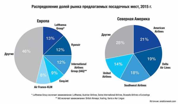 В отличие от своих коллег из США, европейские перевозчики не выиграли от консолидации. В Европе были созданы три большие группы авиакомпаний — International Airlines Group (IAG), Lufthansa Group и Air France-KLM, но их общая доля рынка доступных мест составляет всего около 30%. Для сравнения, три крупнейшие авиакомпании США — American Airlines, Delta и Southwest — контролируют 58% североамериканского рынка, и если к ним добавить United Airlines, то доля предлагаемых мест увеличится до 72%.