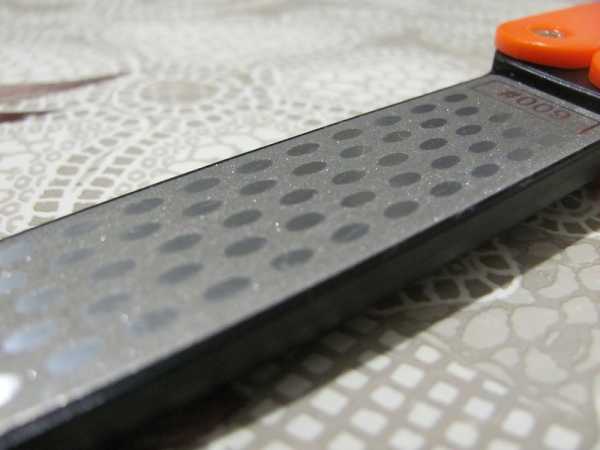 С обеих сторон на него нанесено алмазное покрытие: с одной из сторон оно составляет 400 грит (гритность — это плотность и абразивность камня, чем выше гритность, тем более плотный и мелкий камень), что подходит для использования во время грубой начальной заточки сильно затупившегося лезвия.