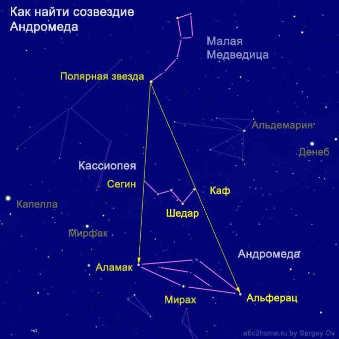 Найти само созвездие Андромеды не сложно. Нужно в первую очередь отыскать Большой Квадрат Пегаса. В северо-восточном углу этого квадрата находится звезда под именем Альферац. Именно это светило является началом Андромеды.