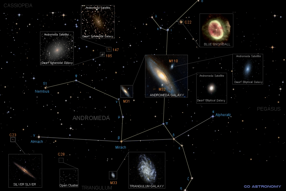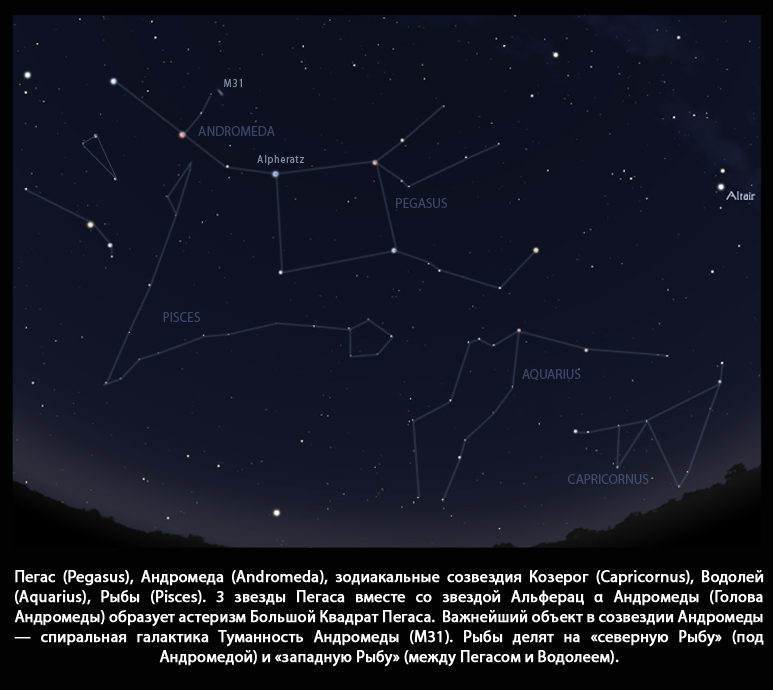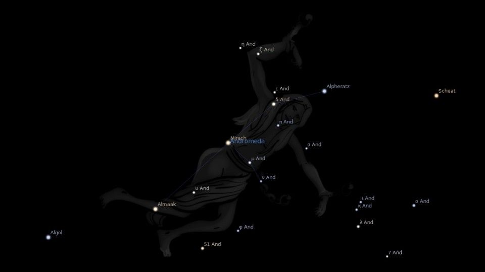 Созвездие Андромеды — располагается в северном полушарии между Пегасом и Кассиопеей. Название оно получило благодаря мифу о принцессе Андромеде. Впервые его в свои каталоги внес еще Птолемей во II веке, но официально же его обозначили только в XVII веке.
