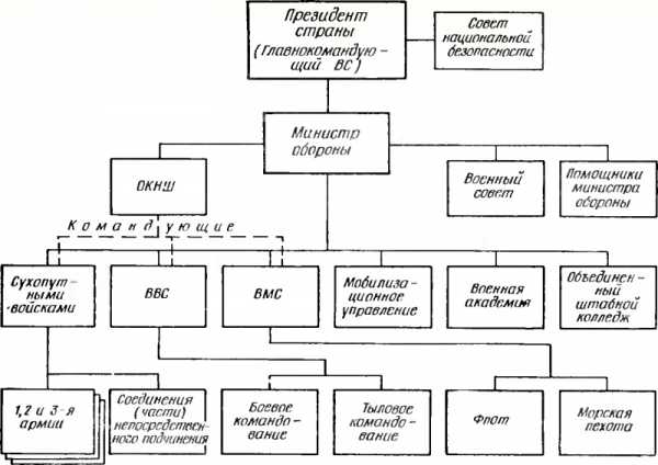 Руководство вооружёнными силами президент осуществляет через министра обороны, а последний — через командующих видами вооружённых сил (начальников штабов), начальника мобилизационного управления и других должностных лиц непосредственного подчинения. В качестве консультативных органов министра обороны служат объединённый комитет начальников штабов (ОКНШ), военный совет и помощники министра. При этом ОКНШ, помимо консультативных функций, выполняет задачи, свойственные генеральному штабу, разрабатывает военную стратегию, планы подготовки страны к войне и боевого применения вооружённых сил, планирует проведение отдельных операций с участием сухопутных войск, ВВС и ВМС, обеспечивает оперативное взаимодействие. Председатель ОКНШ назначается президентом на двухгодичный срок, постоянными членами ОКНШ являются начальники штабов видов вооружённых сил (командующие).