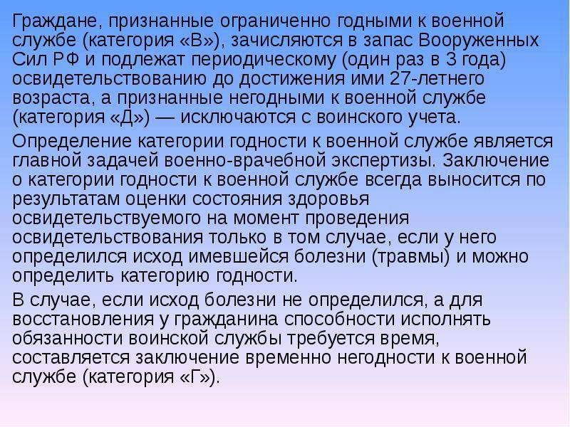 4. Категория «Г» временно не годен. Данную категорию присваивают если есть надежда на восстановление здоровья. Отсрочка дается на 6-12 месяцев, после чего назначается повторная медицинская комиссия, где принимается решение о присвоении новой категории или продления отсрочки. Чаще всего после нескольких таки отсрочек присваивается категория «В». Но бывают случаи когда явно должна была быть постановлена категория «В», а военкомат ставит «Г», что является грубым нарушением законодательства и нужно обжаловать данное решение.