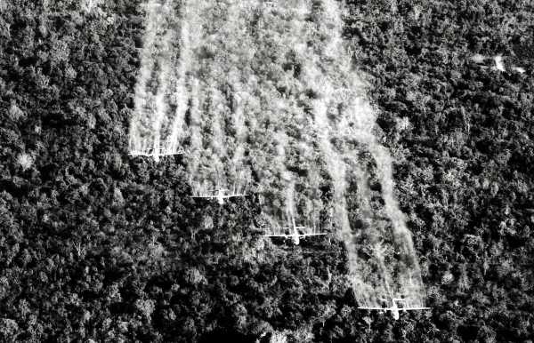 Четыре американских военно-транспортных самолета Fairchild C-123 Provider занимаются распылением жидкого дефолианта (химикатов для уничтожения растительности и всего живого) над позициями войск Северного Вьетнама (сентябрь 1965 года)