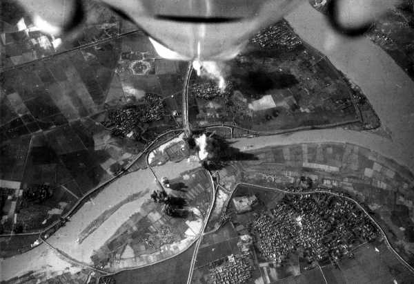 Американский лёгкий палубный штурмовик ВМС США Douglas A-4 Skyhawk наносит удар по железнодорожному мосту в 10 километрах к северу от Thanh Hoe, Северный Вьетнам (10 сентября, 1967 года)