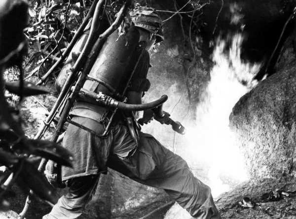 Солдат американской 1-й кавалерийской дивизии направил свой огнемет в сторону входа в пещеру в долине An Lao в Южном Вьетнаме (14 апреля 1967 года)