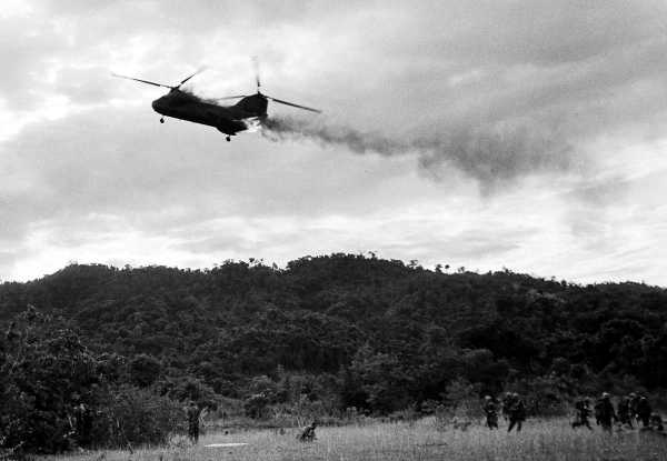 Транспортный вертолет морской пехоты США СН-46, который оказался подбитым огнем с земли к югу от демилитаризованной зоны между Севером и Югом Вьетнама (15 июля 1966 года). Вертолет упал и взорвался на холме, погиб один член экипажа и 12 морских пехотинцев. Три члена экипажа получили тяжелые ожоги