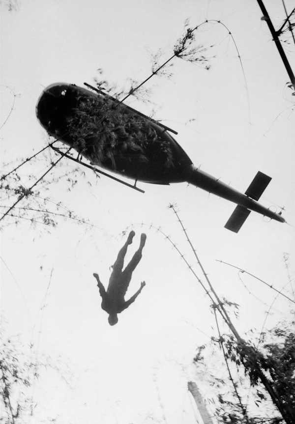Тело американского солдата, который погиб в бою в джунглях недалеко от Камбоджийской границы, поднимают на зависший над землей вертолет в целях его последующей эвакуации (1966 год)