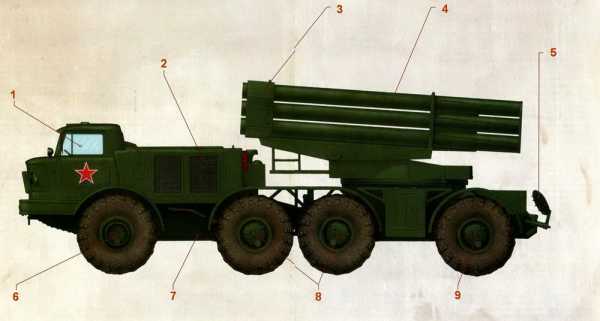 Боевая машина (пусковая установка) боевой массой 20 тонн служит для транспортировки 16 реактивных снарядов, их пуска и поражения целей на площади не менее 42 гектаров. Артиллерийская часть — блок из 16 трубчатых направляющих с прицельными приспособлениями, механизмами наведения, средствами связи и управления — размещена на шасси четырехосного автомобиля высокой проходимости ЗИЛ-135ЛМП (колесная формула 8х8). Блок может наводиться на цель в вертикальной (5–55 град.) и горизонтальной (до 240 град.) плоскостях. Направляющие с П-образным винтовым пазом придают первоначальное вращение снаряду для устойчивого полета по траектории. Реактивные снаряды могут запускаться залпом (интервал 0,5 секунды) и в «рваном» темпе (первые восемь через 0,5 секунды, последующие — через 2 секунды). В последнем случае снижается частота колебаний БМ и повышается кучность стрельбы. Расчет из четырех человек (в мирное время) обеспечивает перевод установки в боевое положение, оставление ею огневой позиции и перезарядку боекомплекта в течение 3, 1,5 и 15 минут соответственно.