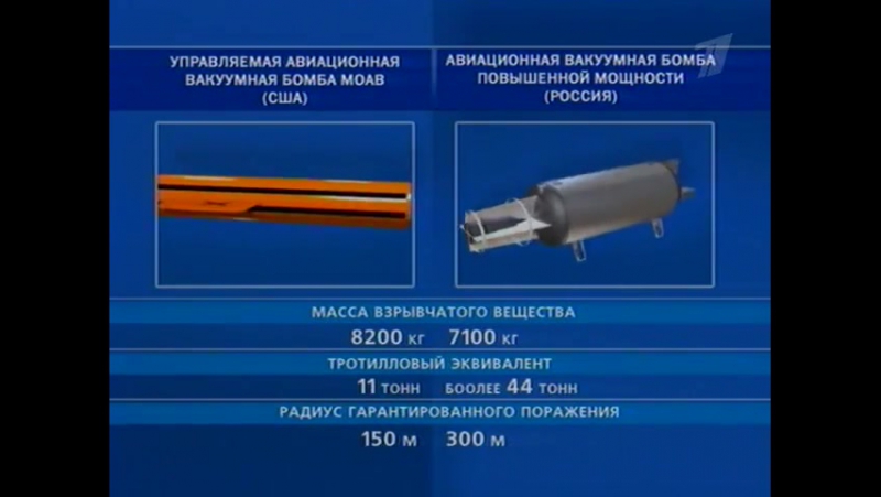 Стратегический бомбардировщик Ту-160 сбросил бомбу массой 7,1 тонны и мощностью около 40 тонн в тротиловом эквиваленте с гарантированным радиусом уничтожения всего живого более трехсот метров. В России этот боеприпас получил прозвище «Папа всех бомб». Он принадлежал к классу боеприпасов объемного взрыва.