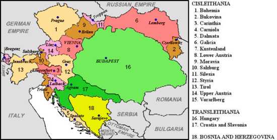 Цислейтания: 1. Богемия, 2. Буковина, 3. Каринтия, 4. Крайна, 5. Далмация, 6. Галиция и Лодомерия, 7. Австрийское Приморье, 8. Нижняя Австрия, 9. Моравия, 10. Зальцбург, 11. Силезия, 12. Штирия, 13. Тироль, 14. Верхняя Австрия, 15. Форарльберг. Транслейтания: 16. Венгрия, 17. Хорватия и Славония, 18. Босния и Герцеговина.