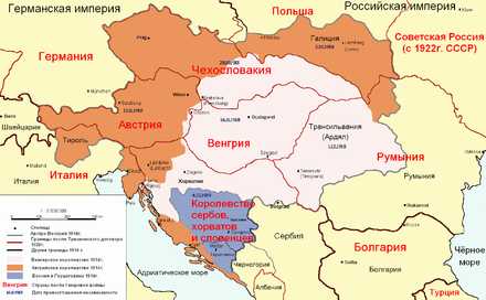 Одновременно с поражением в войне Австро-Венгрия распалась (ноябрь 1918 ): Австрия (в составе немецкоязычных земель) провозгласила себя республикой, в Венгрии король из династии Габсбургов был низложен, а Чешские земли и Словакия образовали новое независимое государство — Чехословакия. Словенские, хорватские и боснийские земли вошли в состав Королевства сербов, хорватов и словенцев (с 1929 — Югославия ). Краковская земля и территории с преобладающим украинским населением (известные в составе Австро-Венгрии как Галиция ) отошли к ещё одному новому государству — Польше. Триест. южная часть Тироля. а несколько позже и Фиуме (Риека ) были аннексированы Италией.