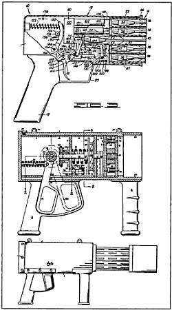 Другая модель зарубежного подводного оружия «активного» типа – револьвер Ф. Стивенса имеет вращающийся блок из 6 стволов калибра .38 (по американской системе калибров, по русской – 9,0; 9,3) и стреляет также стрелами.