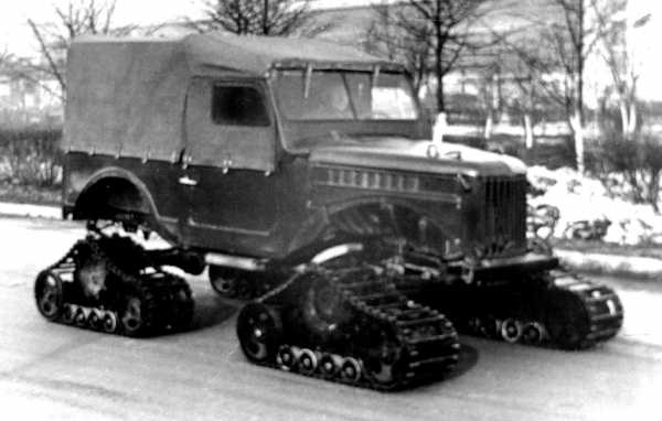 Наиболее совершенными тогда считались опытные образцы полностью гусеничных машин с индивидуальными движителями конструкции С. С. Неждановского с треугольным обводом четырех облегченных гусениц. Первый вариант на шасси ГАЗ-66Б с открытой кабиной снабжался тросовыми бестраковыми гусеницами с верхними ведущими звездочками и двумя натяжными барабанами.