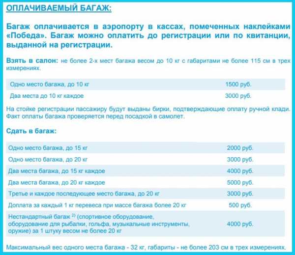 Наиболее низкие расценки используются только в случае, если пассажир принял решение произвести регистрацию в режиме онлайн, либо обратившись на «горячую линию» перевозчика. Авиакомпания «Победа» не предусматривает возможности произвести доплату за превышение размера либо негабаритный груз – только в аэропорту при выходе на посадку в самолет.