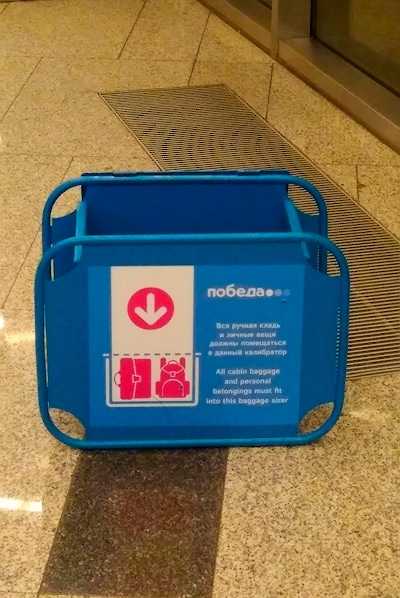 Основным при этом является необходимость поместить их в специально установленный при посадке калибратор авиакомпании «Победа». Под ним подразумевается железный специально разработанный ящик голубого окраса с крышкой. Как правило, он устанавливается у регистрационных стоек компании-перевозчика.