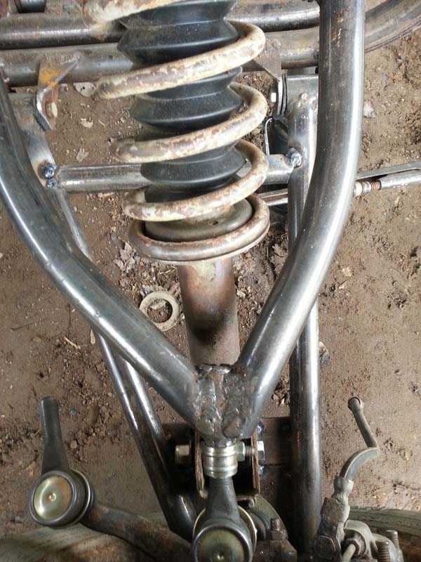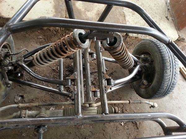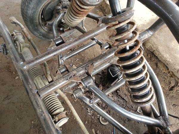 После первых испытаний надежды на компактные легкие аммортизаторы растворились. Поставили по два таких на сторону, стало лучше, ездили на них какое то время, но не то. Кстати краем глаза можете заметить что есть тросик газа, бачки сцепления, тормозов, трубки тормозов и закреплена качественно рулевая рейка. Такого рода моменты требуют много думалки и творчества, поэтому про фото забыли походу. На полу багги — линолеум)) Типа окультурили временно.