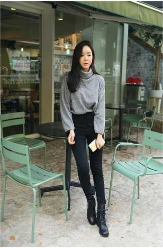 Черные кожаные ботинки на шнуровке СохранитьУдалитьЕсли ты считаешь себя одной из тех девушек, хорошо ориентирующихся в одежде, тебе полюбится тандем серой водолазки и черных джинсов скинни. Выбирая обувь, можно немного побаловаться и завершить наряд ботинками на шнуровке .