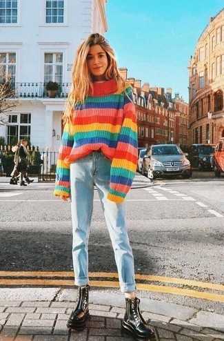 Черные кожаные ботинки на шнуровке СохранитьУдалитьРазноцветный свободный свитер в горизонтальную полоску и голубые джинсы-бойфренды — превосходное решение для дам, которые никогда не могут усидеть на месте. Хотела бы привнести сюда нотку строгости? Тогда в качестве дополнения к этому образу, выбери ботинки на шнуровке.