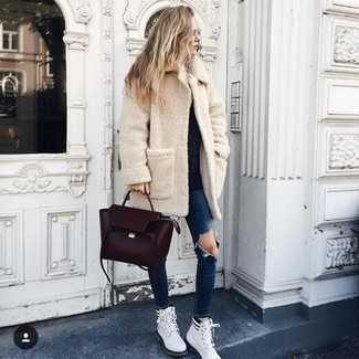 Белые кожаные ботинки на шнуровке СохранитьУдалитьНесмотря на то, что это достаточно легкий лук, ансамбль из бежевого флисового пальто и темно-синих рваных джинсов скинни продолжает покорять сердца многих женщин. Этот лук чудесно закончат ботинки на шнуровке.