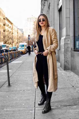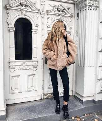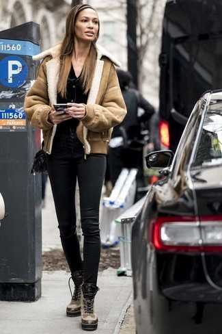 Светло-коричневые кожаные ботинки на шнуровке СохранитьУдалитьПопробуй сочетание светло-коричневой короткой дубленки и черных кожаных узких брюк, и ты получишь стильный расслабленный ансамбль, который подойдет для повседневной носки. Дополнив лук ботинками на шнуровке , можно привнести в него свежие нотки.