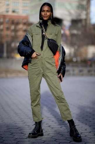 1. Высокие кожаные военные сапоги с серебряными цепочками идеально подойдет к платью цвета хаки из тонкого джерси с погонами и ремнем.