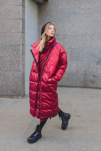 Черные кожаные ботинки на шнуровке СохранитьУдалитьЕсли в одежде ты ценишь комфорт и функциональность, тебе полюбится сочетание красного пуховика и красной юбки-миди с принтом. Такой ансамбль легко адаптировать к повседневным делам, если надеть в паре с ним ботинки на шнуровке.