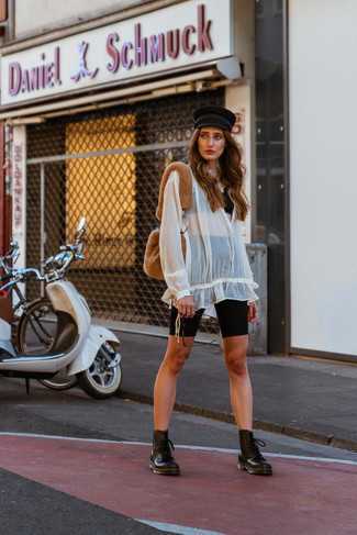 Темно-коричневые солнцезащитные очки СохранитьУдалитьСветло-коричневый плащ и черные велосипедки с принтом — замечательный вариант для расслабленного, но модного образа. Очень недурно здесь смотрятся ботинки на шнуровке.