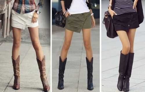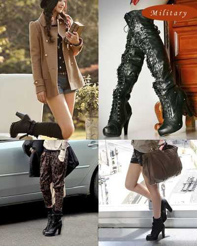 16. Используя в образе ботфорты, в стиле милитари, отделанные различными ремнями и заклепками, пряжками и шнуровкой по всей длине можно подчеркнуть красоту и стройность ног. Добиться сексуального и стильного образа поможет сочетание такой обуви с короткими однотонными платьями или мини-юбками.