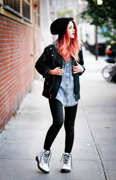 С обувью в стиле милитари хорошо смотрятся кожаные юбки, смотрите подборку отличных луков в нашей статье «22 способа стильно носить обувь с кожаной юбкой»>>>