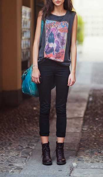 8. Черные узкие брюки с черной удлиненной майкой составят черный ансамбль с боевыми сапогами.