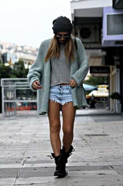 4. Военные ботинки с джинсовыми шортами — идеально для теплого периода.