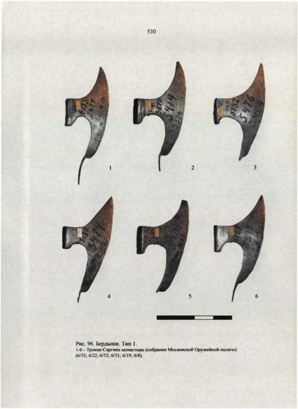 Таким образом, сопоставляя данные изобразительных и вещественных источников и принимая во внимание уже установленную датировку отдельных экземпляров, можно определить типы бердышей, состоявших на вооружении русской пехоты (московских стрельцов и солдат полков «нового строя») в середине и во второй половине XVII века.