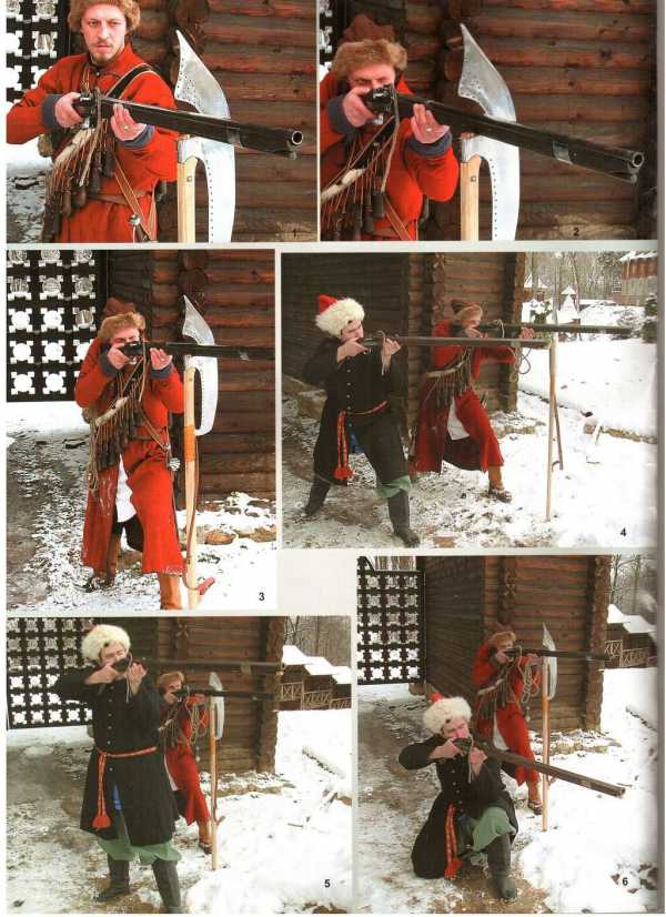 | Опыт по проведению стрельбы из фитильного мушкета без упора на бердыш. Реконструкция комплекса вооружения и обмундирования московского стрельца 5-го приказа головы Федора Александрова, 50-е годы XVII века. Фото выполнил А. Е. Писарев. На фото С. Филимонов |