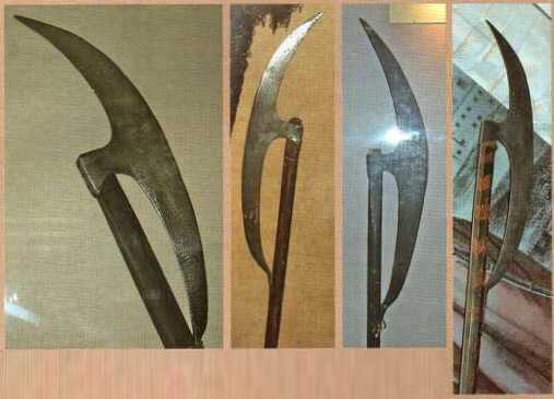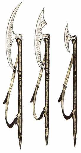 Надо отметить, что применялся такой тип оружия не только в Европе, в Египте в 15 веке использовали похожие секиры с полотнами месяцевидной формы, их нижний конец упирался в древко. Считается, что они дали жизнь турецким топорам «тебер».