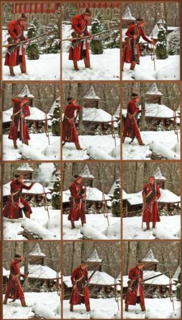 | 1 – стрелец вращением раздувает фитиль. 2, 3 – стрелец засыпает порох на полку замка. 4,5 – стрелец засыпает в ствол мушкета порох из банделерного «зарядца». 6 – стрелец закладывает в ствол мушкета пыж. 7, 8 – стрелец «прибивает» шомполом заряд в стволе мушкета. 9 – стрелец вкладывет горящий фитиль в жагры замка. 10 – выстрел без упора на бердыш: хорошо видны искры от воспламенившегося на полке замка пороха. 11 – стрелец обслуживает мушкет после выстрела. 12 – стрелец готов к перестроению. |