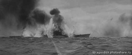 Четыре торпеды поражают «Бисмарк» от носа до кормы.
