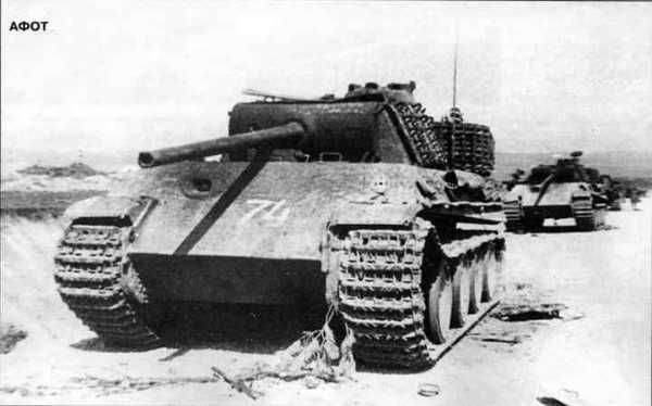 Шестая машина в колонне. Номер советской трофейной команды «73». Несмотря на дополнительную защиту башни из траков, эта «Пантера» Ausf G была расстреляна из засады снайперским огнём.