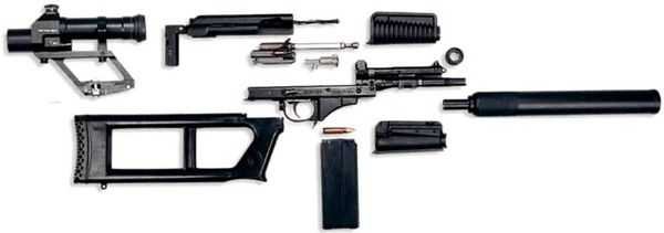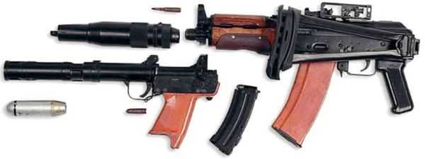 В этом компактном комплексе, выполненном на основе АКС 74У, сочетаются не только два типа снарядов (пуля и граната), но и два основных принципа снижения уровня звука выстрела — расширение пороховых газов и их отсечка.