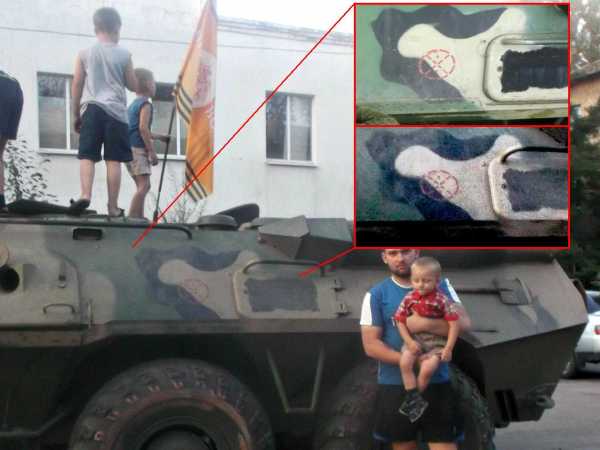 Содержимое фотографий говорит само за себя: российские военные в форме без опознавательных знаков на бронетранспортёрах БТР-82АМ с треугольниками, нанесёнными белой краской: